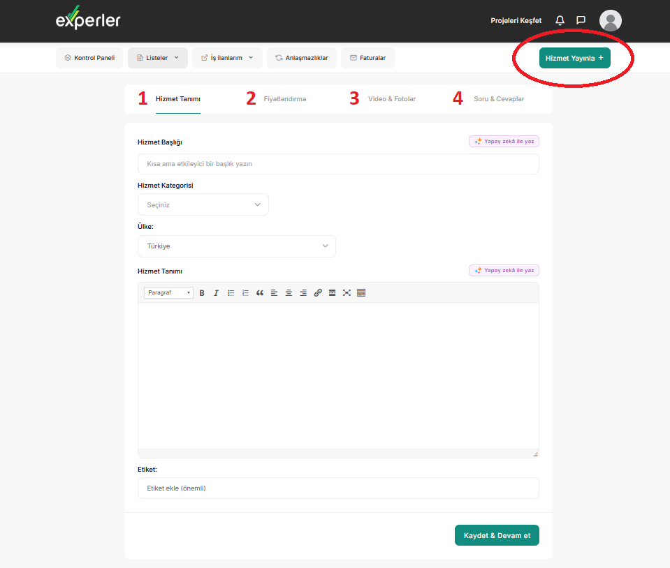 Hizmet başlığı kısa ve öz yazılmalı. Dilerseniz yandaki “Yapay zekâ ile yaz” butonundan faydalanabilirsiniz.